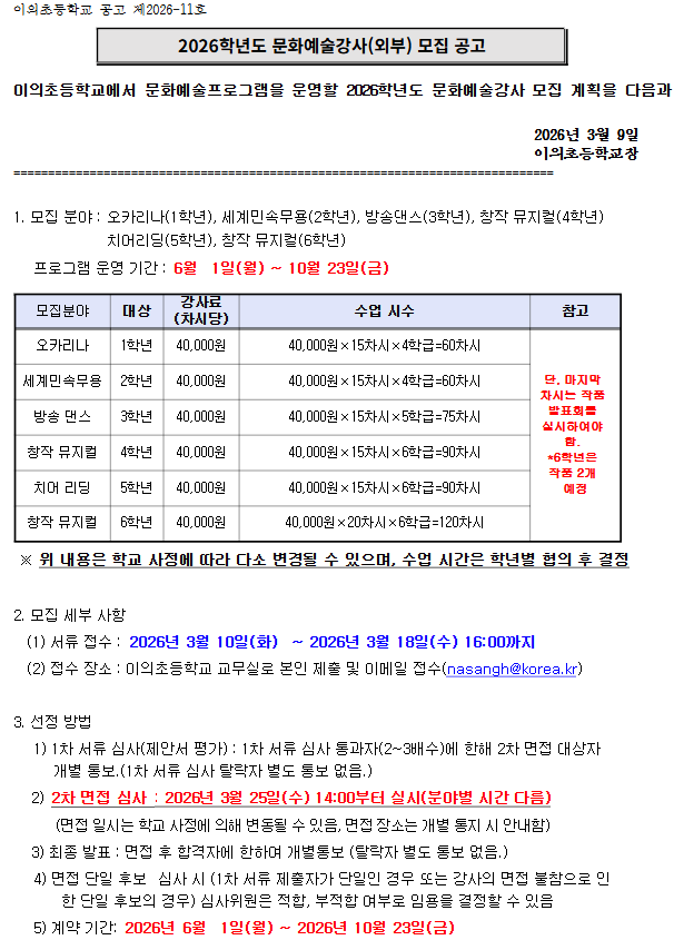 오카리나, 세계민속무용,방송댄스,치어리딩,뮤지컬(2개 학년)